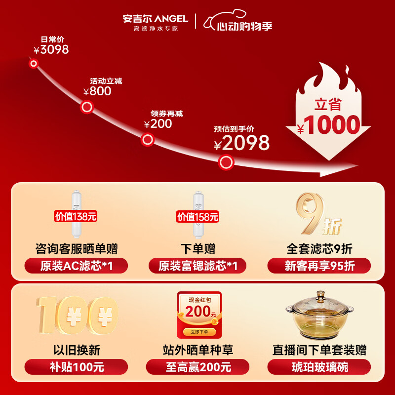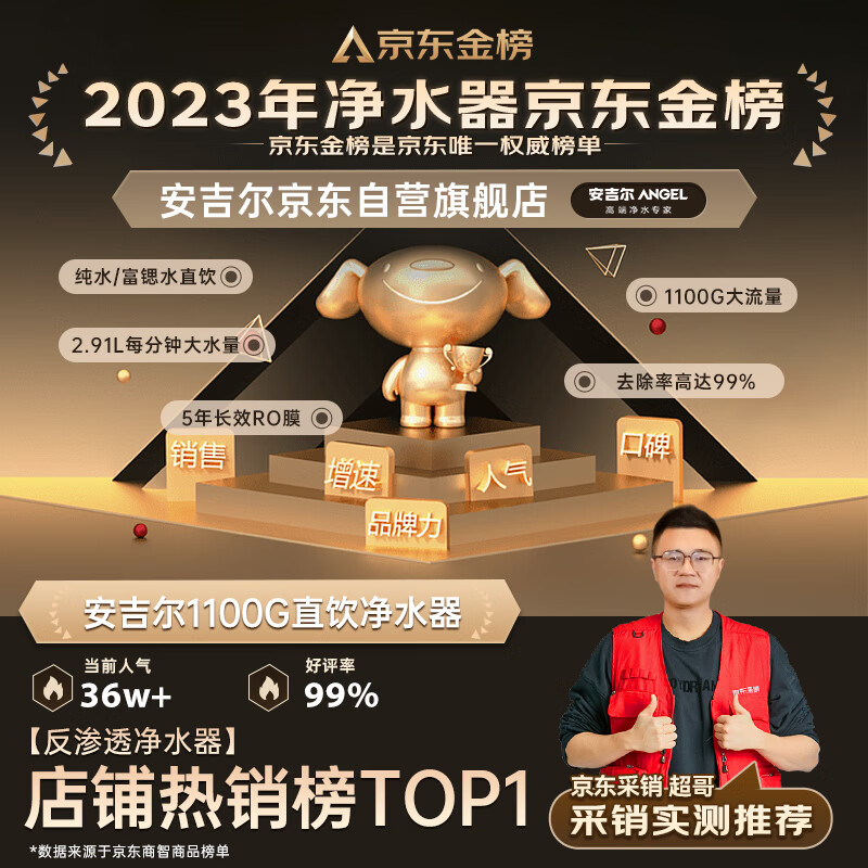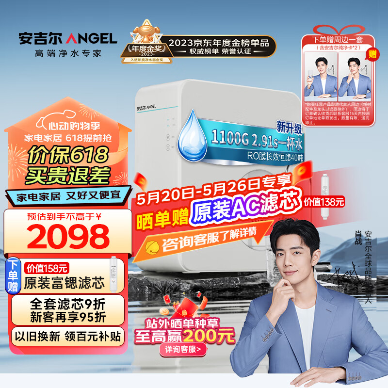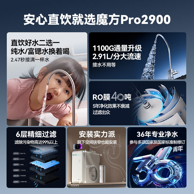 安吉尔【肖战代言】净水器家用净水机1100G富锶水/纯水5年ro反渗透厨下式直饮机2.91L/分魔方pro2900价格:2298.00元!