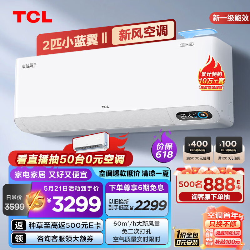 TCL 新风空调2匹新一级变频60?/h大新风量 小蓝翼Ⅱ智能空调挂机KFRd-46GW/D-SWA11Bp(B1)一价全包价格:3299.00元!
