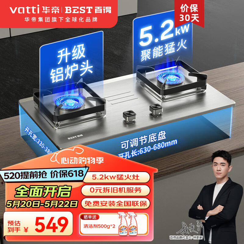 百得(BEST)华帝出品 煤气灶燃气灶天然气液化气双灶炉具 5.2KW家用不锈钢面板猛火台嵌入两用式灶JZT-QE50G价格:649.00元!