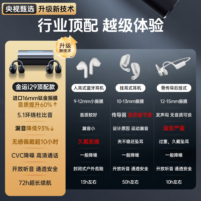 金运【双金标音质|版】蓝牙耳机真无线开放式骨传导概念夹耳式不入耳运动跑步通话降噪迷你耳夹式价格:118.00元!