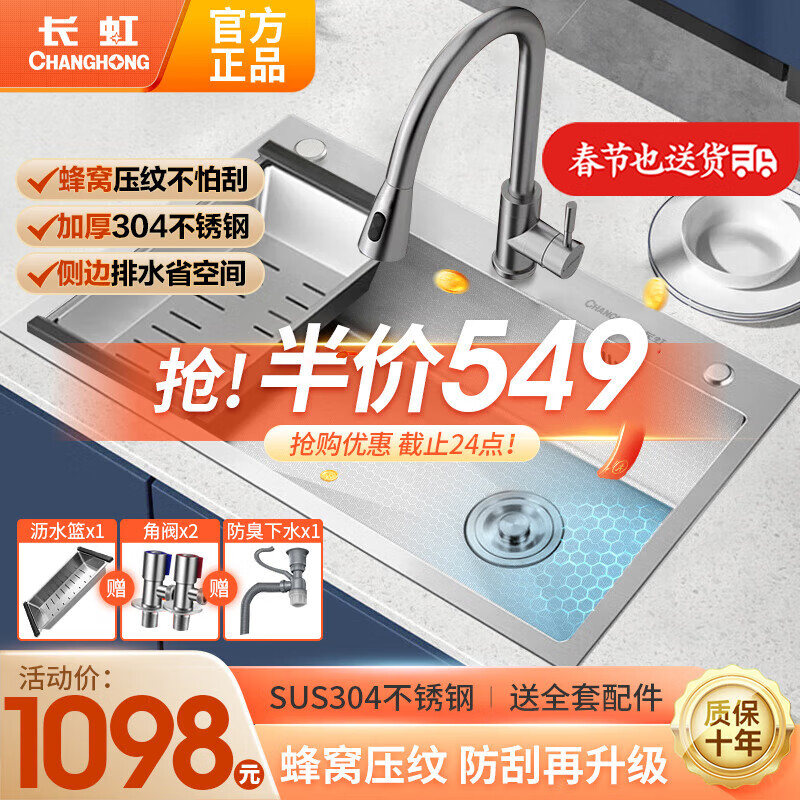 长虹(CHANGHONG)水槽洗菜盆大单槽 厨房304不锈钢压纹加厚侧排一体洗菜池洗碗槽价格:1098.00元!