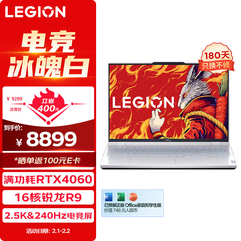 联想(Lenovo)拯救者R9000P 游戏笔记本电脑 16英寸专业电竞本(R9-7945HX 16G 1T RTX4060显卡 2.5K 240Hz屏)白价格:8899.00元!