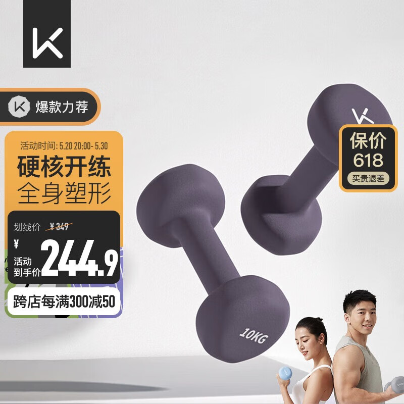 Keep彩色浸塑哑铃男士家用家庭健身肌肉塑形暮山紫 10kg*2价格:244.90元!