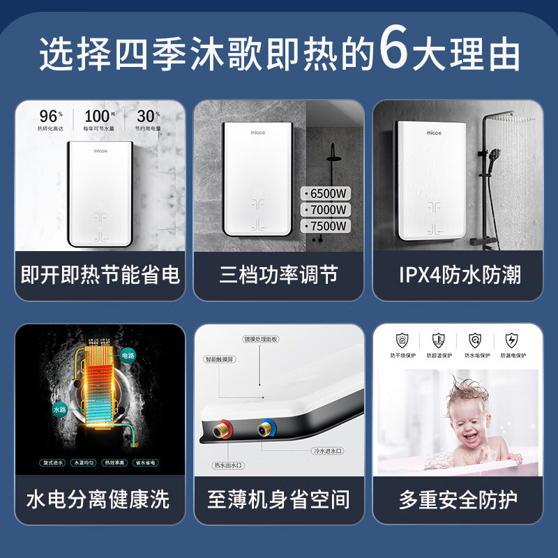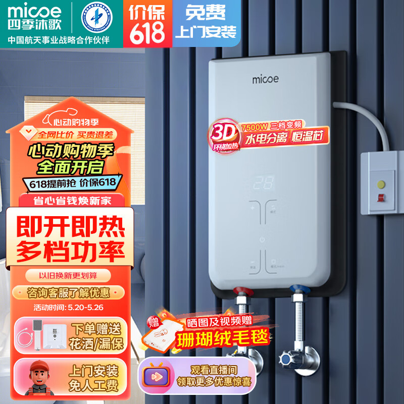 四季沐歌(MICOE)即热式电热水器 变频过水热速热恒温扁桶家用洗澡淋浴无胆免储水 7500W变频+上门安装价格:679.00元!