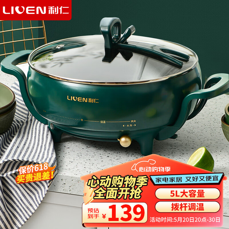 利仁(Liven)电煮锅电火锅家用火锅锅多功能锅多用途锅电热锅烤肉锅宿舍小电锅电煎锅5升 DHG-J282价格:139.00元!