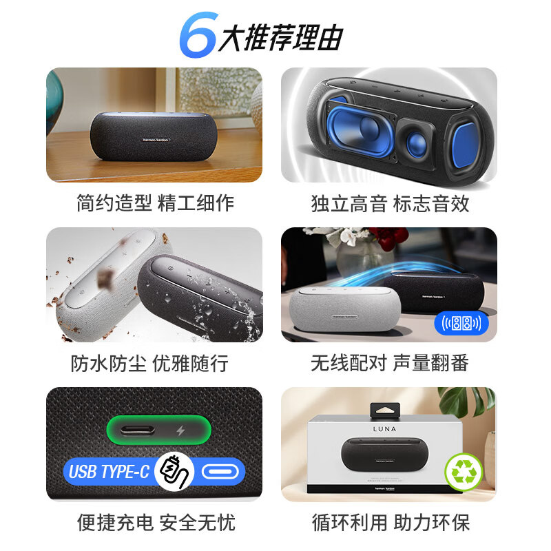 哈曼卡顿 LUNA 便携蓝牙音箱 赛道扬声器系统 超长续航 独立高音单元 IP67防水防尘音响 黑色价格:1099.00元!