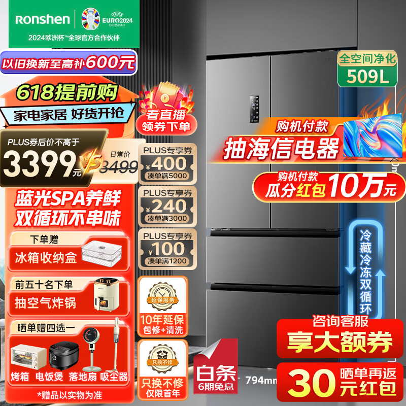 容声冰箱四开门509升变频一级能效超薄家用无霜除菌双循环双系统家用法式冰箱BCD-509WD18MP[官方直发]价格:3499.00元!