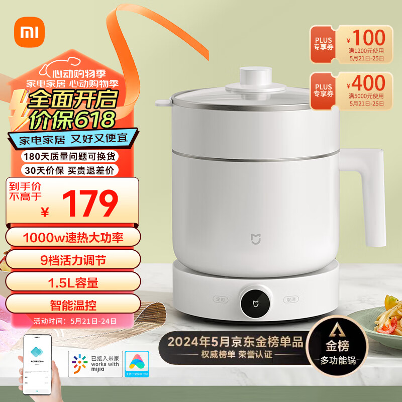 米家小米智能多功能锅电煮锅电蒸锅宿舍泡面锅小火锅 蒸煮焖炖涮一体 防溢分体式 智能互联1.5升价格:179.00元!