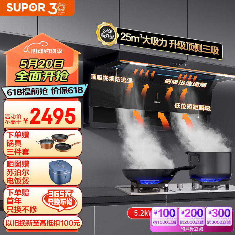 苏泊尔(SUPOR)抽油烟机 双腔拢烟顶侧双吸油烟机灶具套装 25立方大吸力变频烟灶 家用油烟机燃气灶 DL35+DS37天价格:2495.00元!
