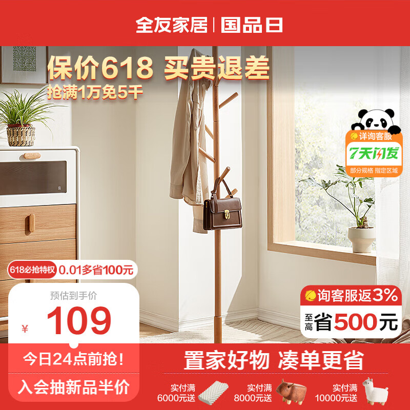 全友家居 衣帽架挂衣架实木橡胶木单杆落地卧室北欧简约DX115061价格:155.71元!