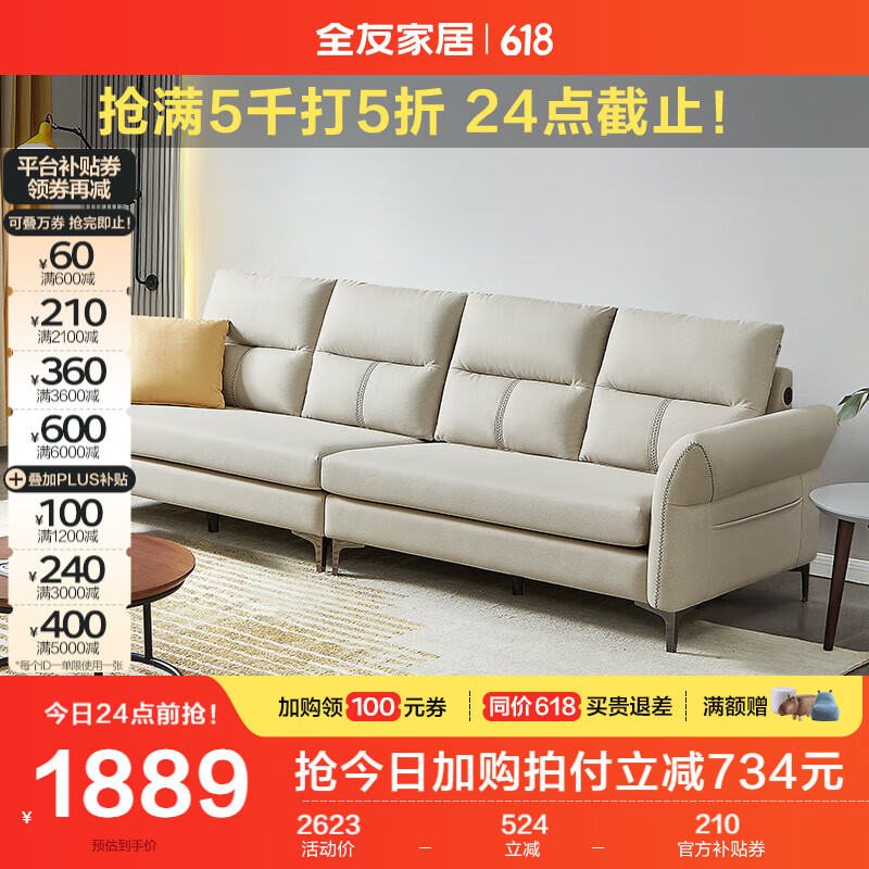 全友家居 现代简约功能科技布艺可拆洗储物小户型直排沙发客厅102679价格:2623.75元!