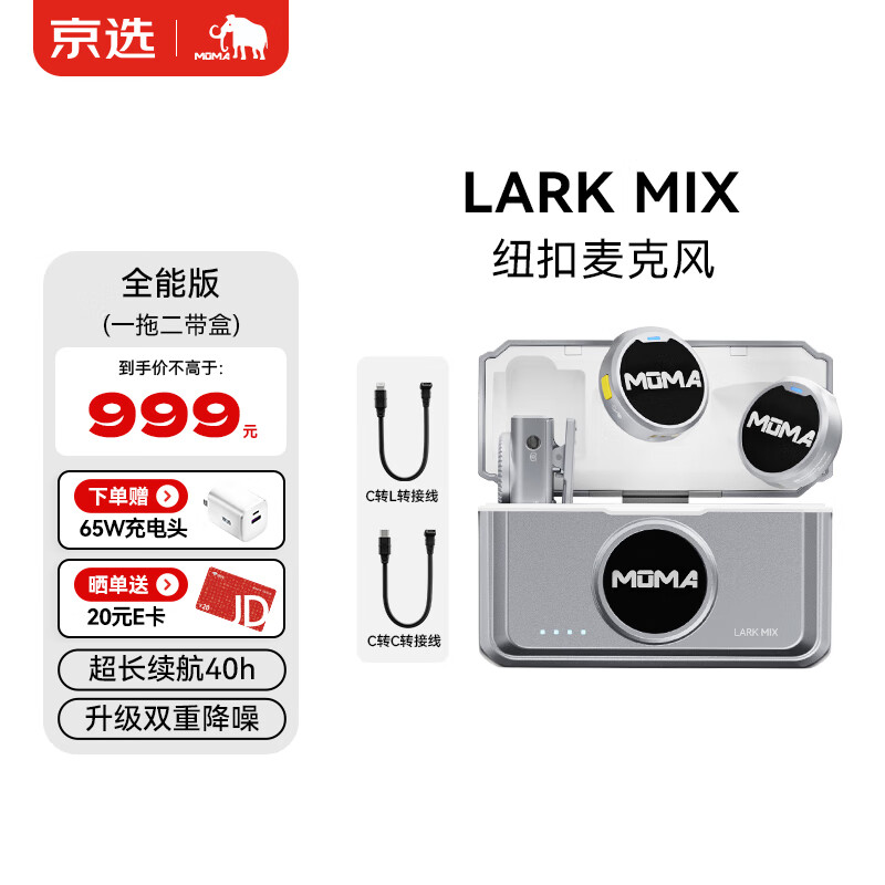 猛玛(MOMA) Lark Mix联名款领夹麦克风 一拖二无线麦克风手机相机直播微小型纽扣收音麦全能版银色价格:949.00元!