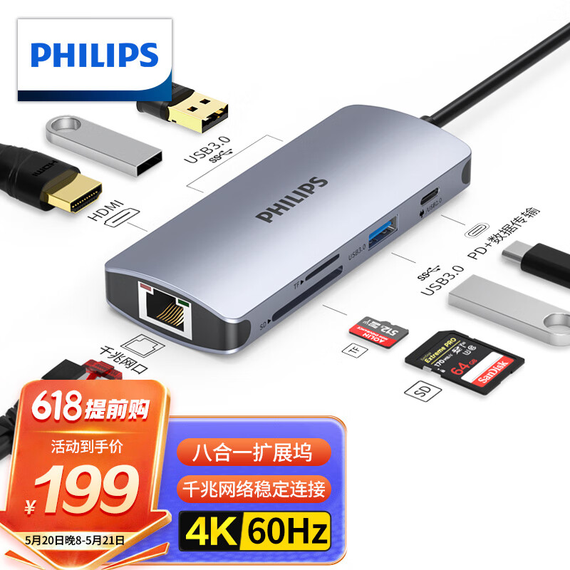 飞利浦Type-C扩展坞4K60Hz投屏usb-c转hdmi转换器千兆网线口分线器适用苹果华为笔记本iPad雷电4拓展坞价格:249.00元!
