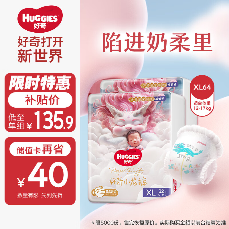 好奇(Huggies)皇家御裤小龙裤成长裤XL64片(12-17kg)婴儿尿不湿龙纹裤新老发货价格:135.90元!
