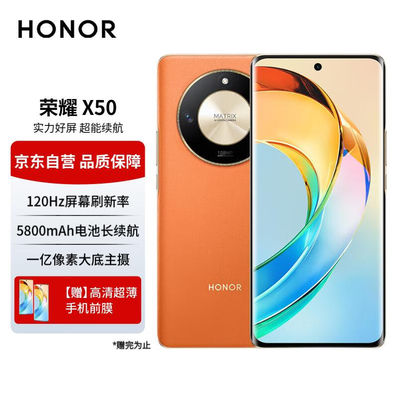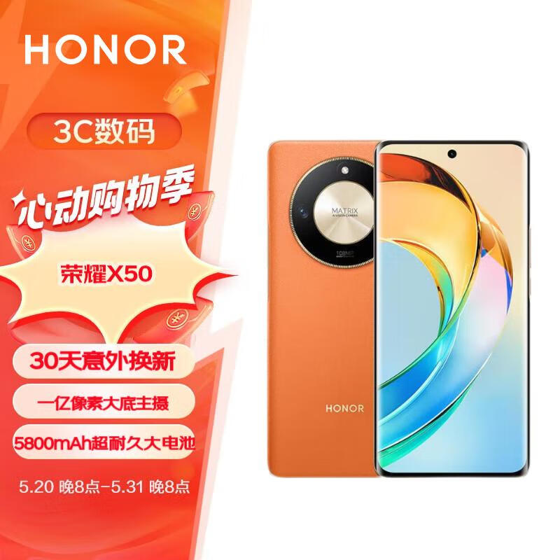 荣耀X50 代骁龙6芯片 1.5K超清护眼硬核曲屏 5800mAh超耐久大电池 5G手机 8GB+256GB 燃橙色价格:1369.00元!