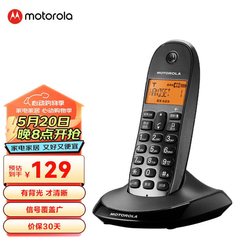 摩托罗拉(Motorola)数字无绳电话机 无线座机 子母机单机 有背光 才清晰 办公家用 来电显示 三方通话 C1001XC(黑色)价格:129.00元!
