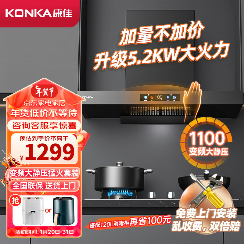 康佳(KONKA)抽油烟机燃气灶具套装 欧式22m3爆炒大吸力 变频1100Pa大静压烟灶套装KT60B+B500F(天然气)价格:1299.00元!