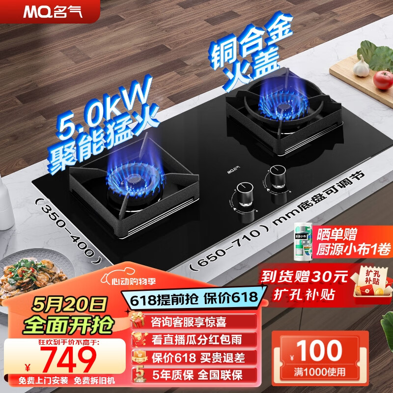 名气(MQ)老板燃气灶天然气嵌入式 家用5.0KW大火力猛火灶 煤气灶双灶 可调节底盘 钢化玻璃灶具 JZT-A6510B价格:749.00元!