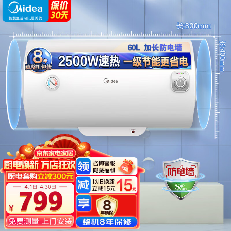 美的(Midea)电热水器2500W速热家用一级能效60升节能省电加长防电墙漏电提醒小型储水式F6025-A5(HE)价格:799.00元!