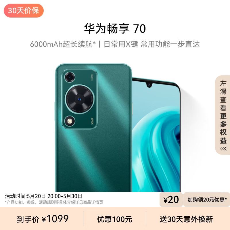 华为畅享 70 6000mAh大电池 长续航 畅享X键一键直达 128GB 翡冷翠 鸿蒙智能手机HUAWEI价格:1199.00元!