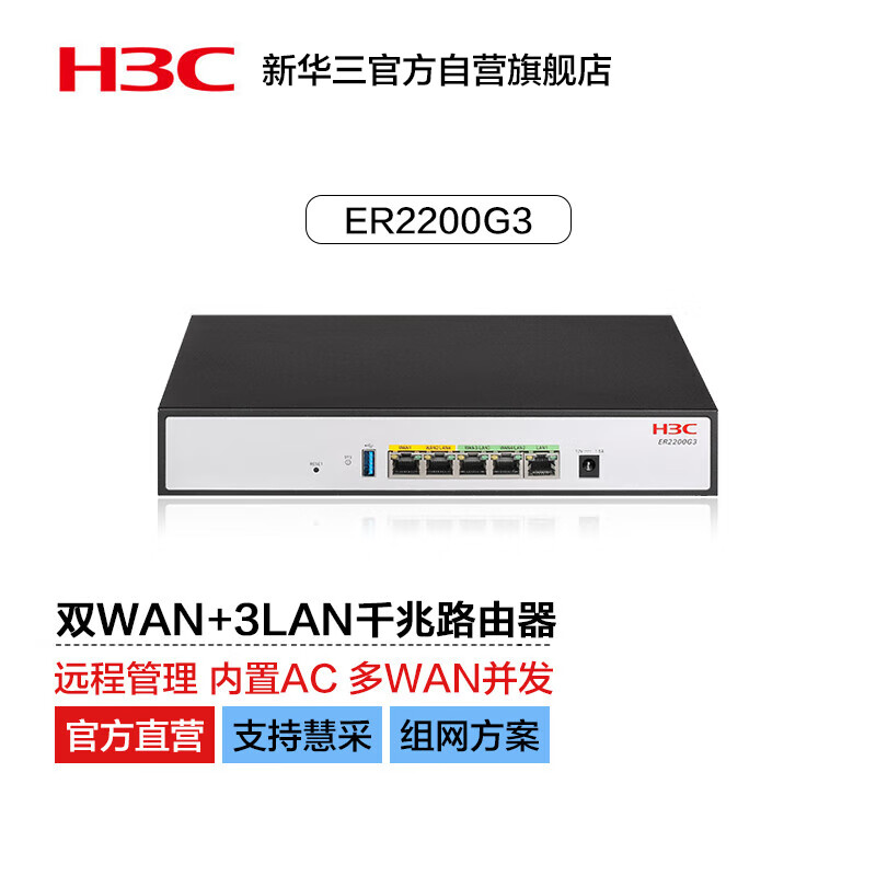 新华三(H3C)双WAN+3LAN千兆企业级有线路由器 带机100 AC管理/无风扇/上网管理 ER2200G3价格:659.00元!