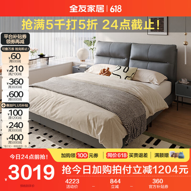 全友家居 头层牛皮现代简约真皮艺软包床1.8x2米主卧室双人大床116019价格:4223.75元!