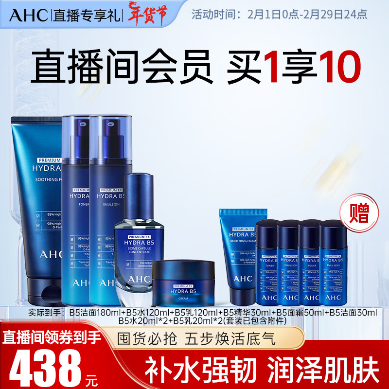 AHCB5臻致舒缓水乳玻尿酸护肤品套装(水+乳液+洁面+精华+面霜)价格:438.00元!