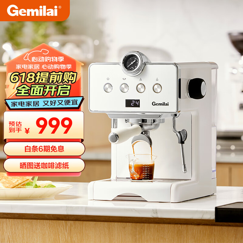 格米莱(GEMILAI)咖啡机小型家用 意式浓缩 半自动 蒸汽打奶泡机 意式浓缩泵压式萃取CRM3610价格:999.00元!