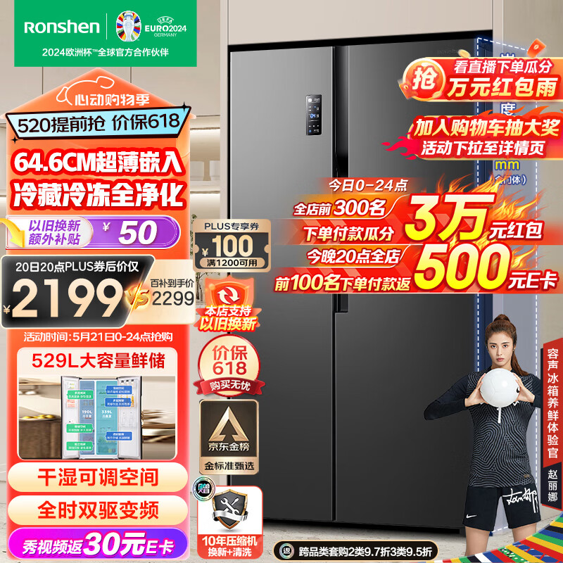 容声(Ronshen)离子净味529升变频一级能效对开门双开门冰箱家用无霜除菌BCD-529WD18HP超薄嵌入式大容量价格:2299.00元!
