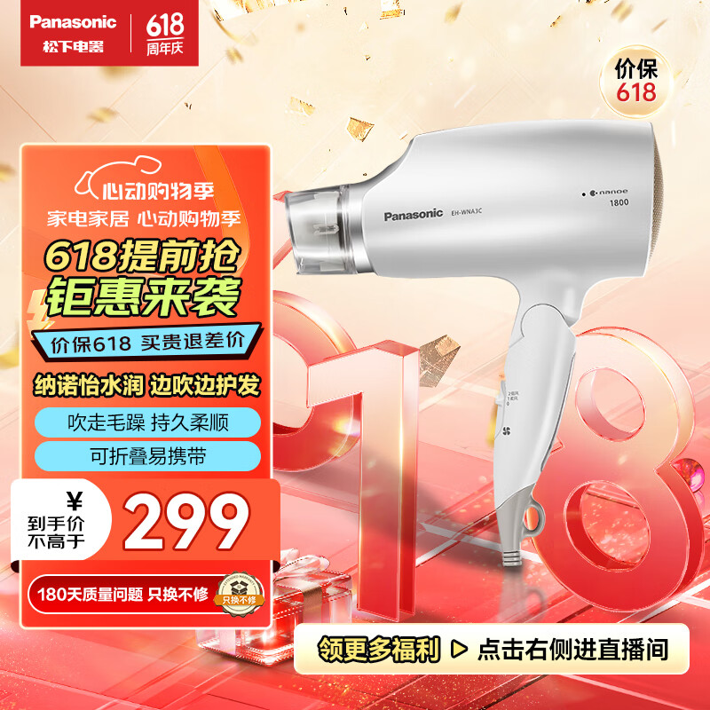 松下(Panasonic)电吹风机大功率高速大风力速干折叠便携 家用纳诺怡水润护发电吹风筒老婆女友EH-WNA3C价格:299.00元!