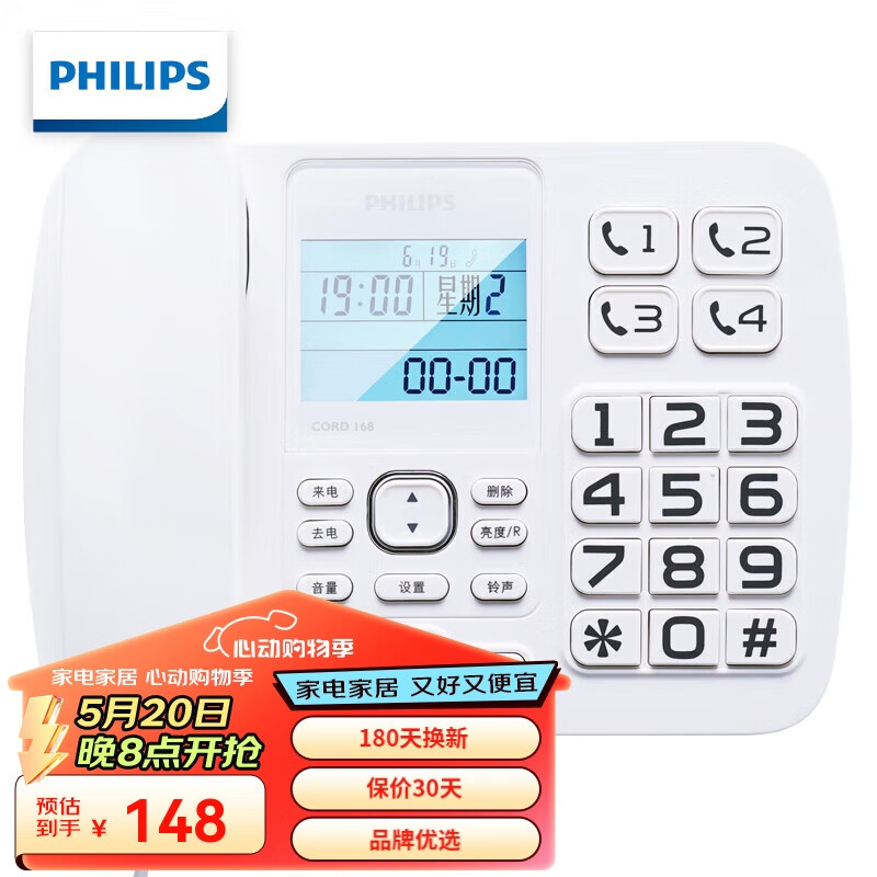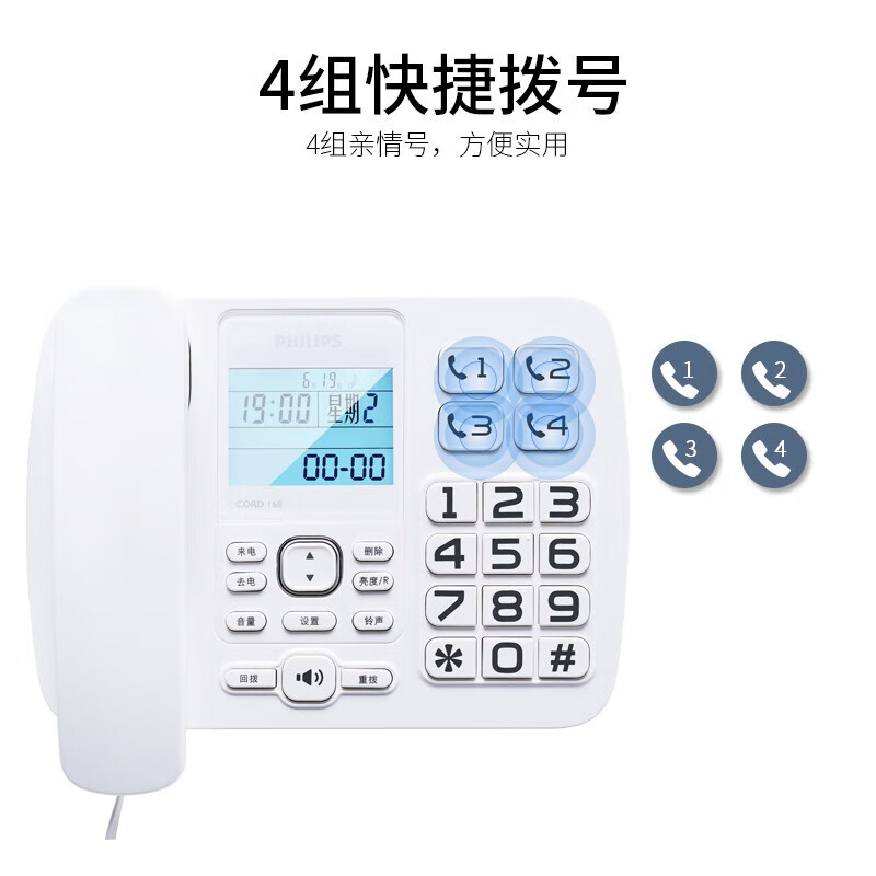 飞利浦(PHILIPS)电话机座机 固定电话 办公家用 来电报号 大屏大按键 CORD168白色价格:148.00元!