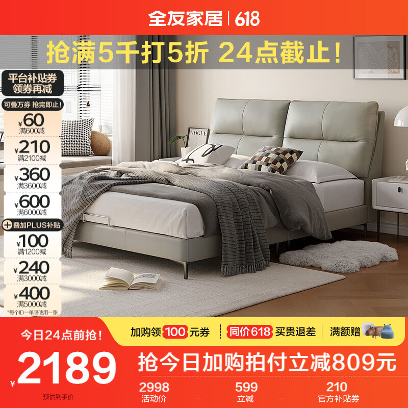全友家居 现代简约高脚真皮艺软包床主卧室双人大床1.8x2米家具116019价格:2998.75元!