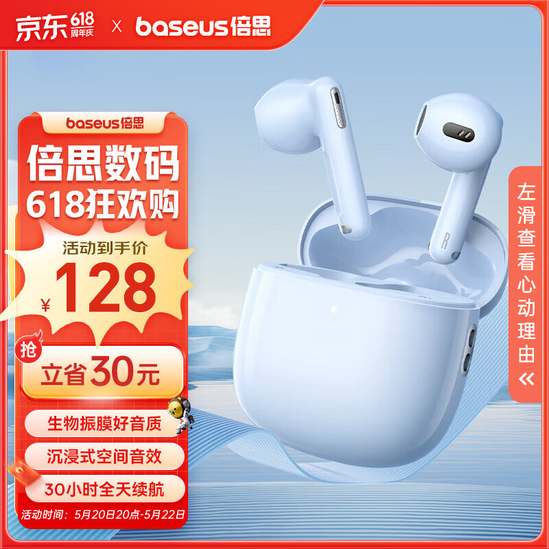 倍思WX5 真无线蓝牙耳机 半入耳舒适佩戴 通话降噪调节音乐音量 蓝牙5.3适用苹果小米华为OPPO 蓝色价格:158.00元!