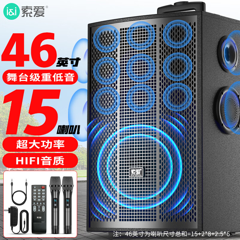 索爱(soaiy)SA-F87大功率15喇叭重低音广场舞音响移动家用户外K歌蓝牙拉杆便携式音箱扩音器带无线话筒15英寸价格:1399.00元!