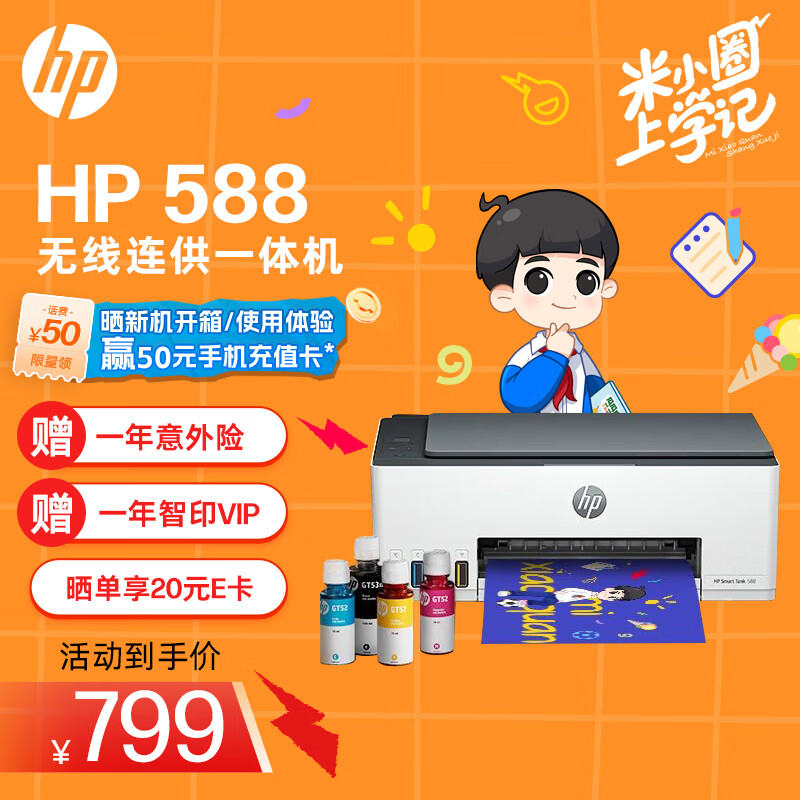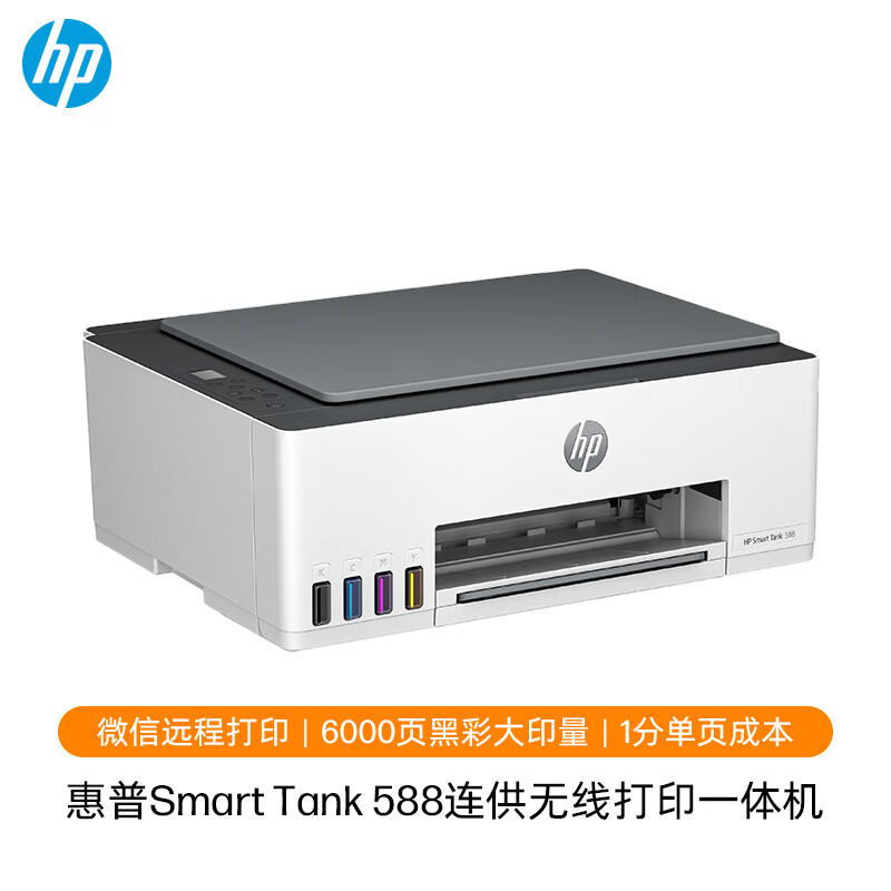 惠普(HP)588彩色打印机学生家用喷墨 无线连供打印复印扫描照片打印 低成本 一年上门价格:799.00元!
