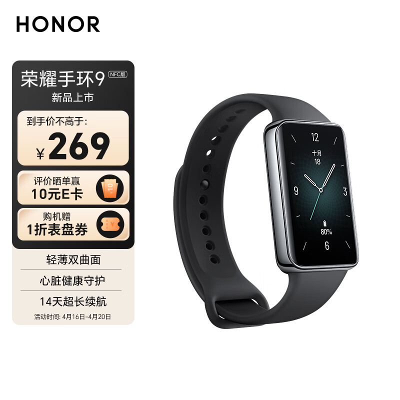 荣耀(HONOR)手环9 NFC版 曜石黑 轻薄双曲面 心脏健康守护 14天超长续航 智能手环运动手环价格:269.00元!