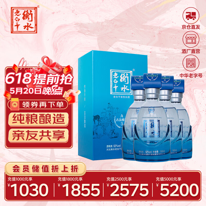 衡水老白干古法酿造A3 老白干香型纯粮 52度 500ml*4瓶整箱装 聚会宴请价格:429.00元!