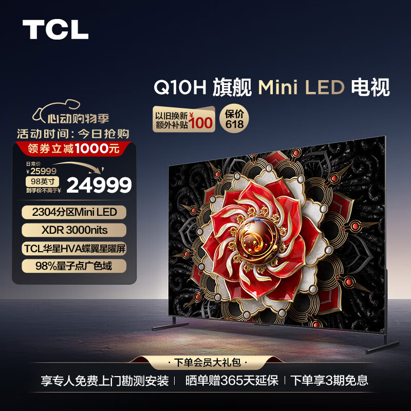 TCL电视 98Q10H 98英寸 Mini LED 2304分区 XDR 3000nits 4K巨幕 液晶智能平板电视机100价格:25999.00元!