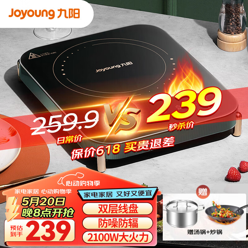 九阳(Joyoung)电磁炉套装电磁灶电磁灶2100W一键爆炒防辐认证大火力爆炒定时功能C21S-C572配精铁炒锅欧式汤锅价格:239.00元!