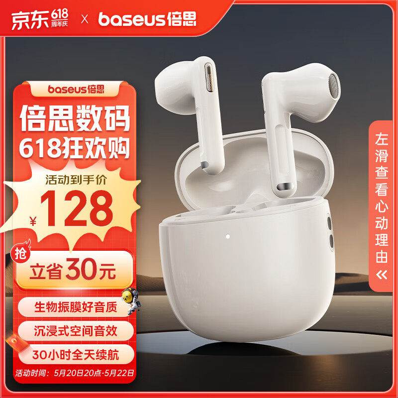 倍思 WX5 真无线蓝牙耳机 半入耳舒适佩戴 通话降噪调节音乐音量 蓝牙5.3适用苹果小米华为OPPO 白色价格:128.00元!