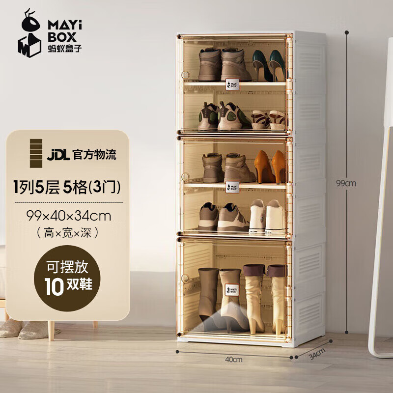 蚂蚁盒子(MAYIHEZI)免安装简易鞋柜门口家用玄关透明茶色塑料入户折叠鞋柜 1列5层5格价格:309.00元!