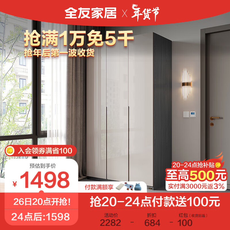 全友家居 衣柜卧室极简风模块化收纳智能感应灯平开门储物柜子DG10010价格:2282.86元!