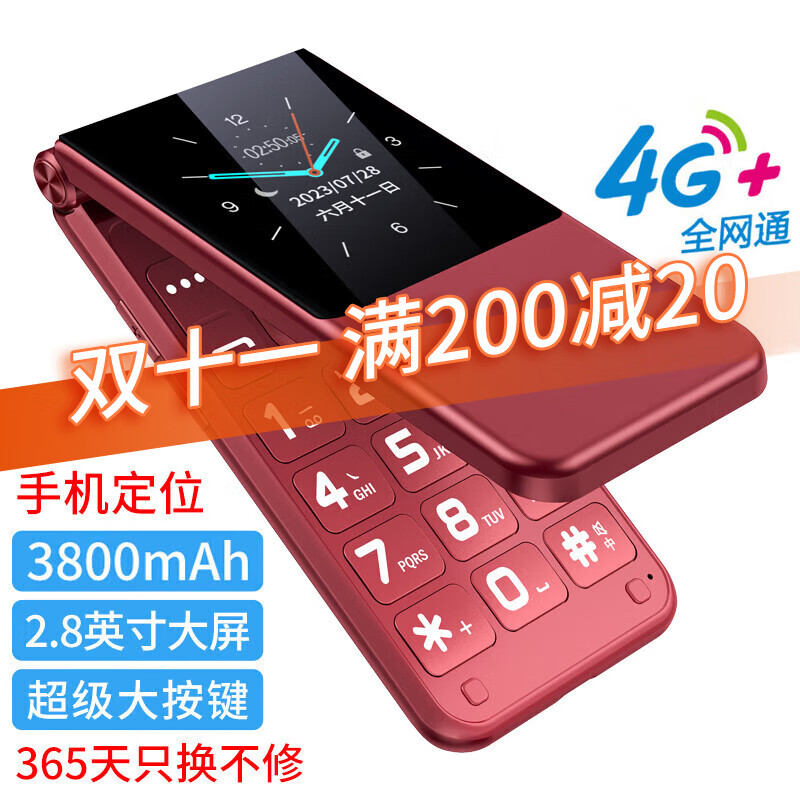 纽曼 Newman V8 酒红色 2.8英寸4G通翻盖老人手机 双屏双卡双待大字大声音大按键老年机 学生备用功能机价格:188.00元!