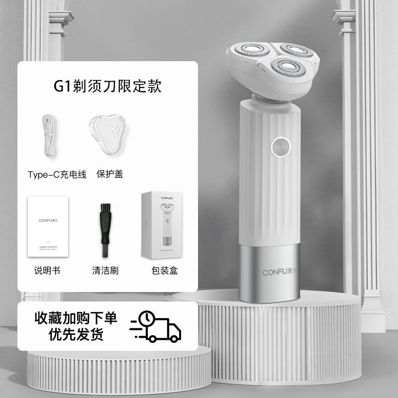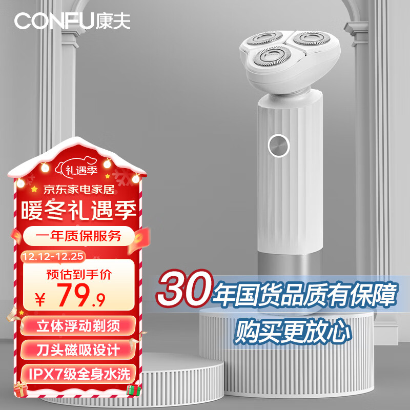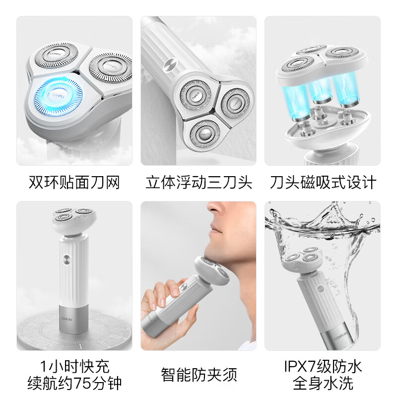 康夫(CONFU)剃须刀电动刮胡刀男士礼物快充全身水洗干湿两用便携式三刀头胡须刀送男友KF-G1冬羽白价格:99.90元!