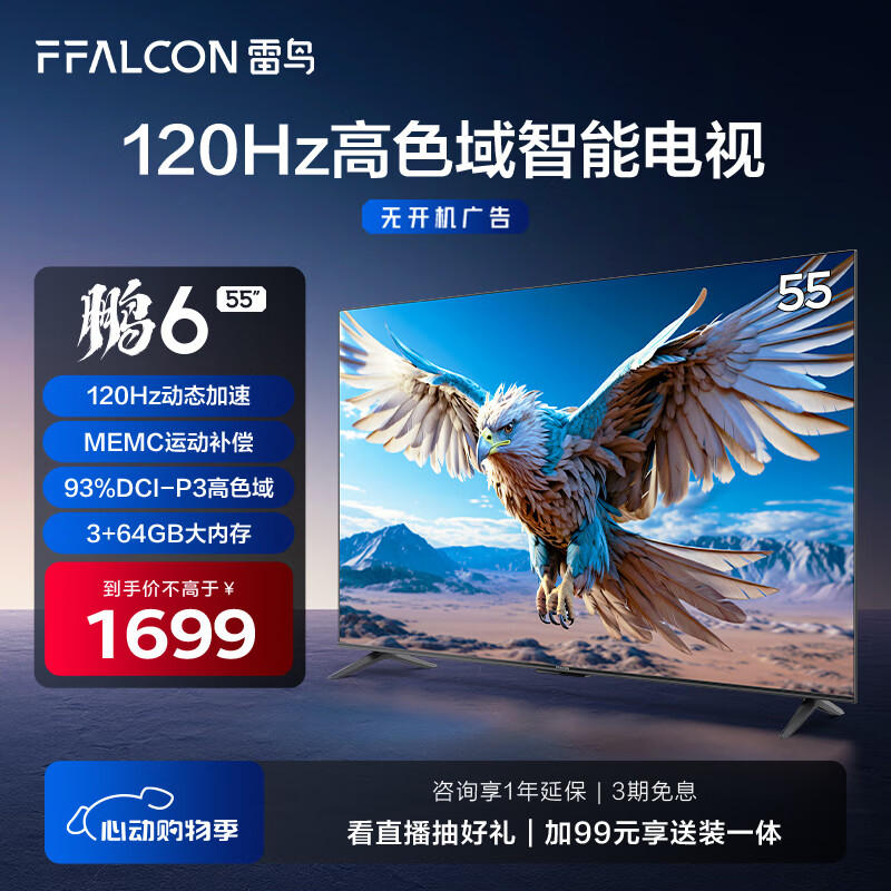 FFALCON雷鸟 鹏6 24款 电视机55英寸 120Hz动态加速 高色域 3+64GB 智能游戏液晶平板电视以旧换新55S375C价格:1799.00元!