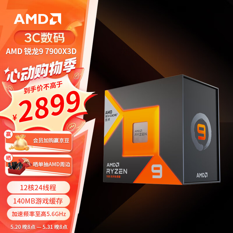 AMD 锐龙9 7900x3D游戏处理器(r9) 12核24线程 140MB游戏缓存 加速频率至高5.6GHz 盒装CPU价格:2899.00元!