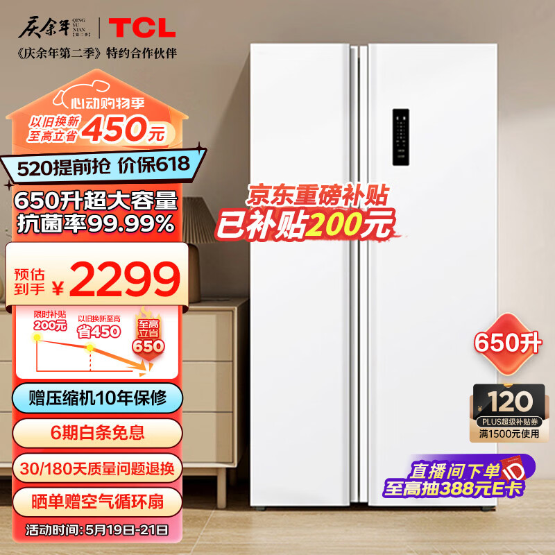 TCL650升T5超大容量对开双开门多门白色冰箱一级能效 风冷无霜 一体双变频 家用电冰箱R650T5-S芭蕾白价格:2499.00元!
