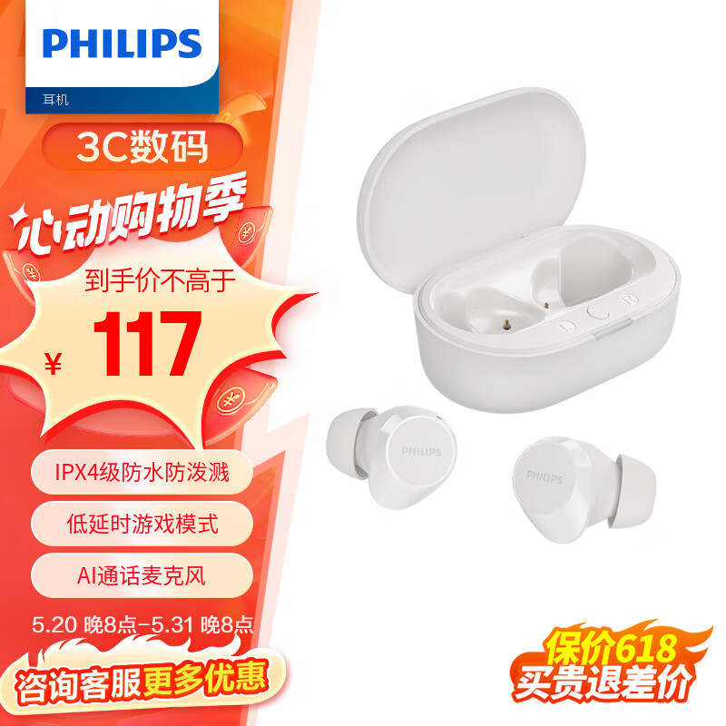 飞利浦(PHILIPS)豆式入耳耳机真无线蓝牙耳机运动耳机游戏耳机回音降噪智能配对苹果华为手机TAT1209白色价格:117.00元!