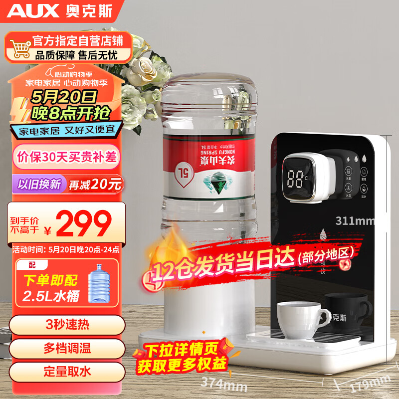 奥克斯(AUX)即热式饮水机 家用速热饮水机 办公室小型台式迷你智能饮水器【2.5L水桶】价格:299.00元!