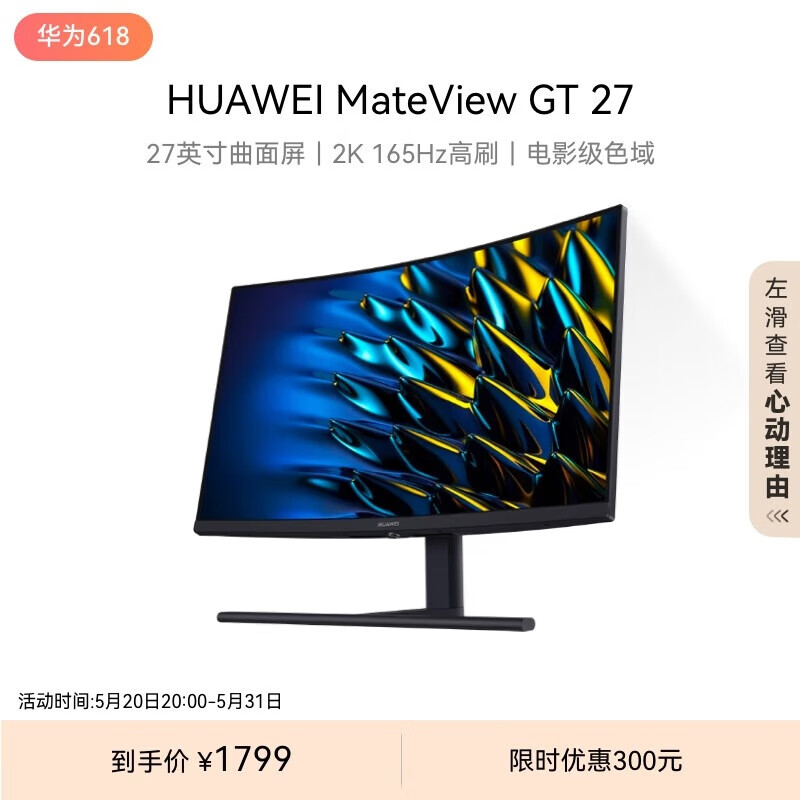 华为MateView GT 27英寸曲面显示器 2K 165Hz 可壁挂 低蓝光无频闪 升降俯仰调节 游戏电竞办公价格:1799.00元!